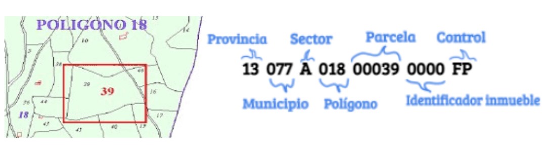 - Referencia Catastral Rústica, en la que los dos primeros números representan la provincia, los tres siguientes el municipio, el siguiente carácter se refiere al sector, los tres próximos corresponden al polígono del término municipal, los cinco consiguientes identifican la parcela, los cuatro de al lado se refieren al identificador del inmueble dentro de la propia parcela, y los dos últimos caracteres son de control, cuya función es la misma que en la referencia catastral urbana.
